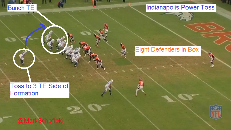 The offense puts Andrew Luck under center and uses a bunch formation on the left with the three TEs. Then the Colts run a toss play to that side of the field, with Dan Herron coming behind the three big bodies: