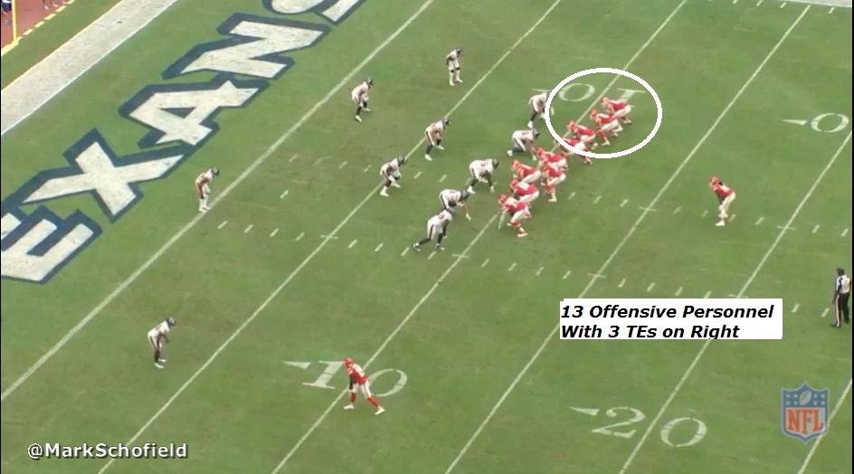 13 offensive personnel is a heavy – or “jumbo” grouping with one running back, one wide receiver and three tight ends. This personnel group is primarily used in the red zone or in short-yardage and goal line situations, giving the offense three tight ends to use either as run blockers or as big targets on smaller defenders in the secondary.