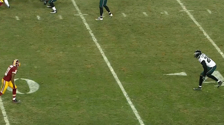 Speedy wideout DeSean Jackson (#11) runs straight downfield, while Bradley Fletcher (#24) backpedals. Fletcher bails and tries to run with his former Eagles teammate, but it’s too late. The receiver is just too fast, easily creating separation, and the throw drops in for a 55-yard gain.