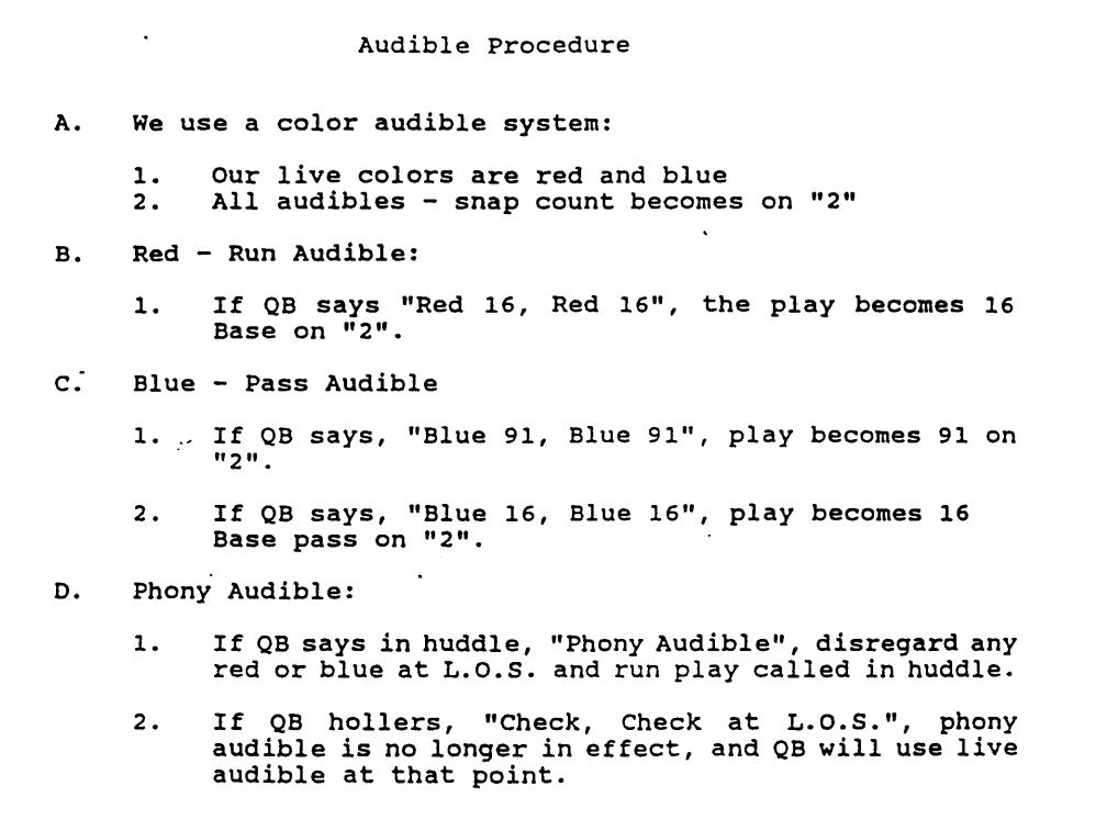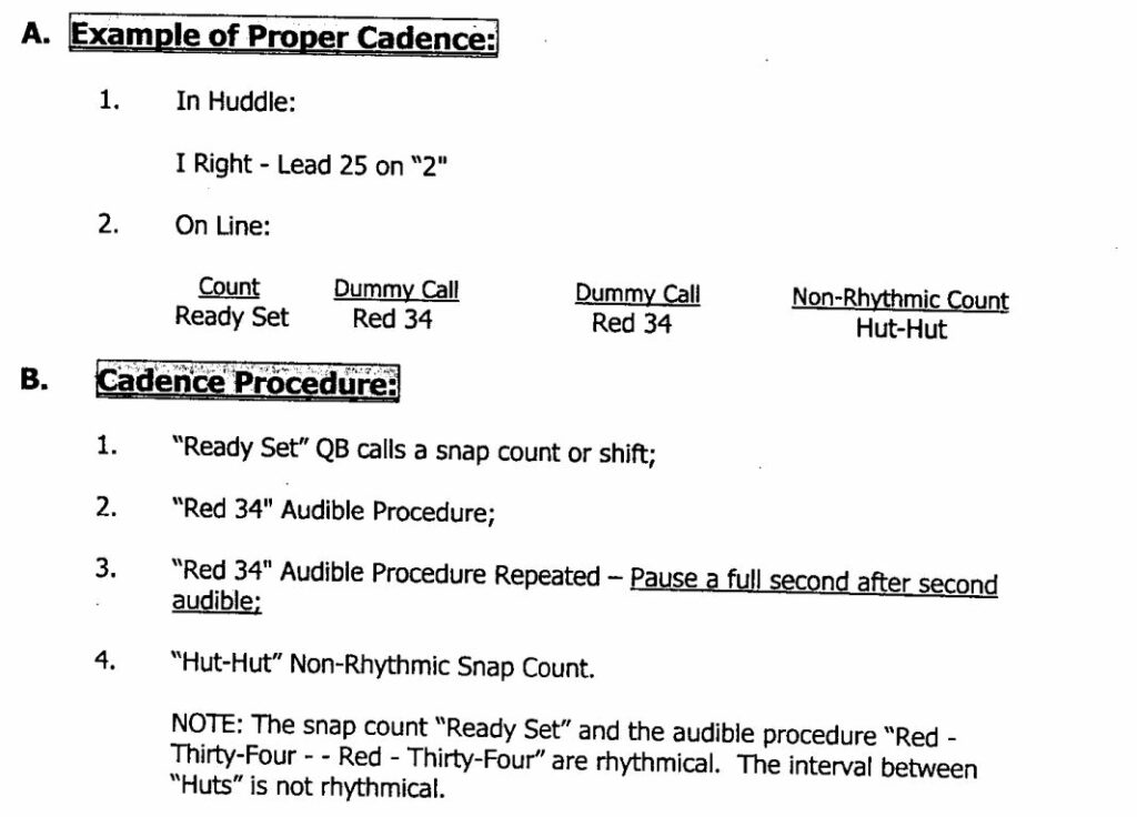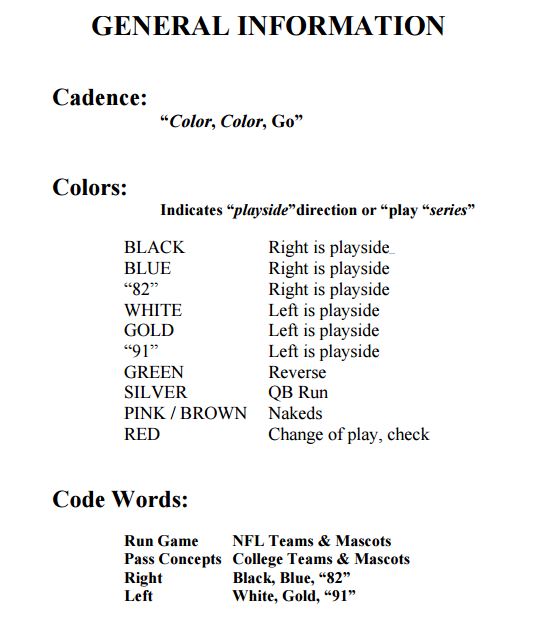The team uses a count, followed by two calls, and then the snap count. The “count” is built in for pre-snap shifts or motions. The color and number signals are used for their audible structure, and the snap count is delivered by the quarterback. As you can see, even the flow and rhythm of the calls and snap count are determined in the playbook.