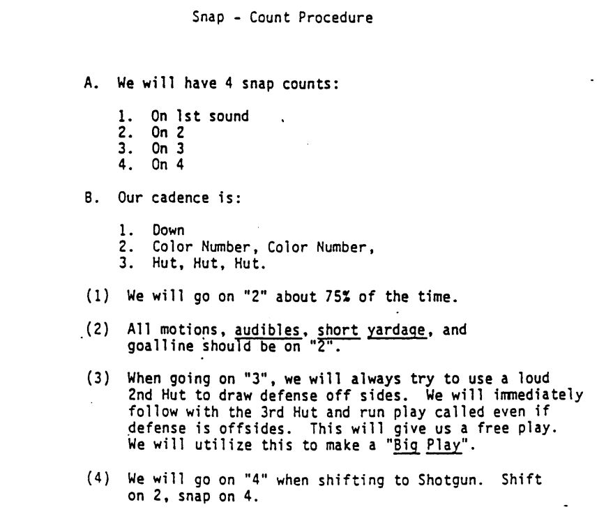 Finally, here is the cadence and snap count procedure from Steve Spurrier and the 1995 Florida Gators:
