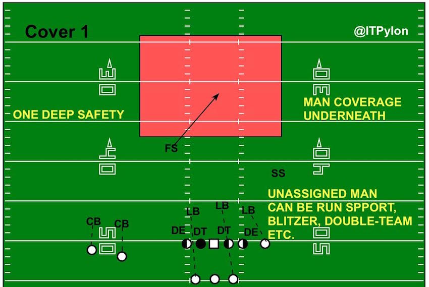 Cover 1 or “man-free” is a man-to-man defensive scheme with one free safety in a deep zone in the middle of the field. The cornerbacks and underneath defenders play man coverage. With only one deep safety, the defense has an extra unassigned man. That player – usually a linebacker or strong safety – can provide run support, blitz the quarterback, bracket, or double-team a dangerous middle-of-the-field receiver, spy on a running QB, or play a robber role by lurking in an underneath zone.