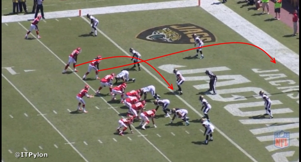 On this play from 2013, the Kansas City Chiefs score a touchdown against Jacksonville in their season opener using the drive concept. Alex Smith (#11) stands in the shotgun and has trips formation to his left. The inside two receivers execute the drive routes: