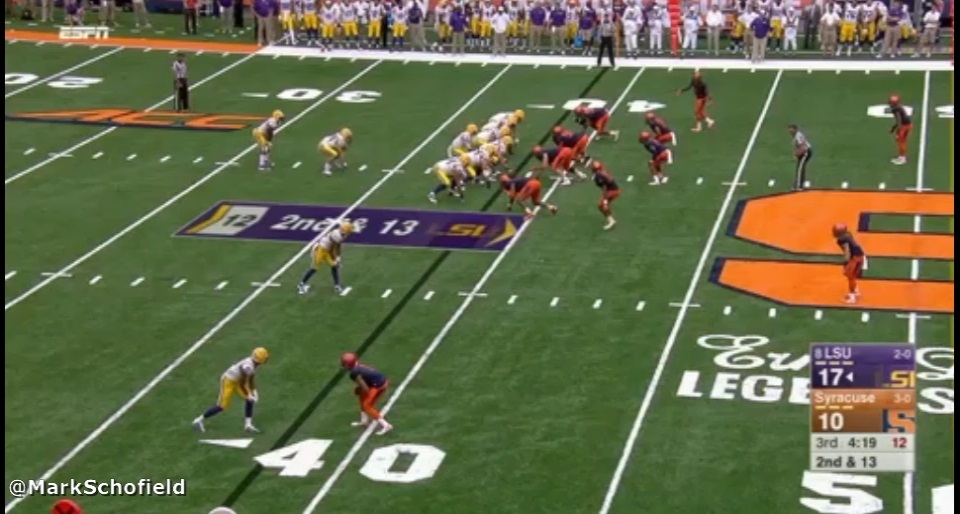 The LSU Tigers deploy 21 offensive personnel with quarterback Brandon Harris under center. The fullback John David Moore is in a three-point stance directly behind the QB, with tailback Leonard Fournette in a two-point stance behind him: