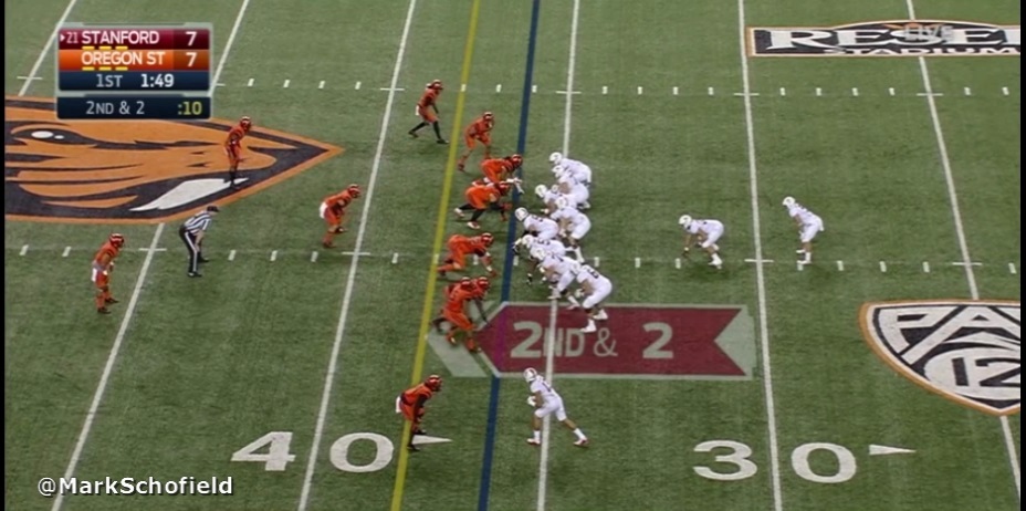 Here, the Stanford Cardinal use 22 offensive personnel and David Bright (#64) normally a guard as a tight end. The offense has a slot formation on the left with Bright in a wing alignment, and i-formation in the backfield with Christian McCaffrey the deep back: