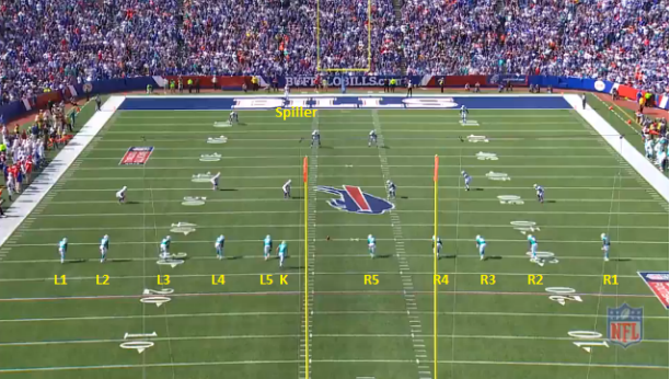 The still above shows the Miami Dolphins set up in 5×5 alignment on kickoff, ready to kick deep to the Buffalo Bills. Kicker Caleb Sturgis is just outside the left hash as he takes a soccer-style approach to strike the ball that is just inside the hash on the 35-yard line.