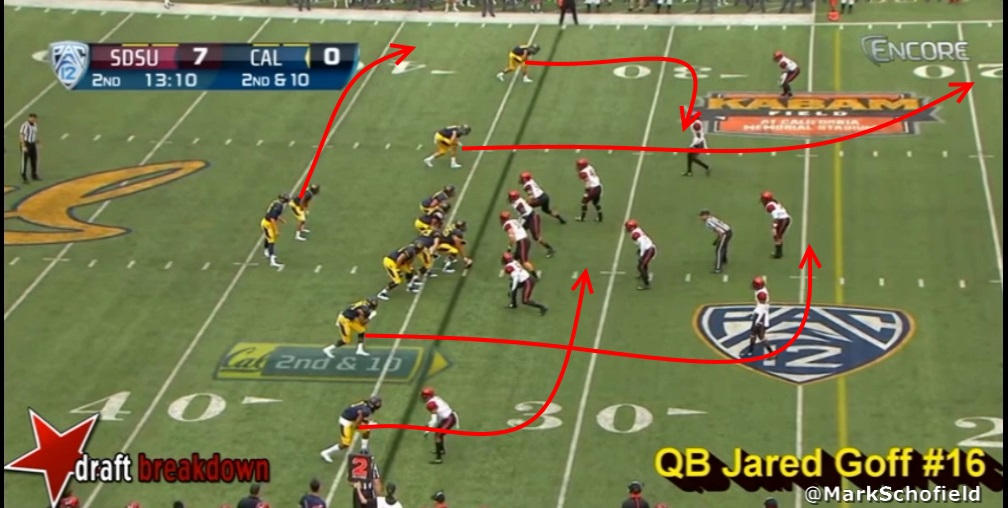 Here, San Diego State uses the design to try and attack California quarterback Jared Goff (#16). The Golden Bears face 2nd and 10 at the Aztecs’ 34-yard line. Goff is in the shotgun with 12 offensive personnel in the game in dual slot formations. On the right tight end Stephen Anderson (#89) is in the slot while WR Maurice Harris (#3) is to the outside. TE Raymond Hudson (#11) is in the slot to the left while WR Kanawai Nkoa (#81) aligns outside. The defense has 3-3-5 personnel in the game, using the radar alignment up front and showing Tampa 2 coverage in the secondary, using the fifth defensive back in the deep LB drop zone in that scheme: