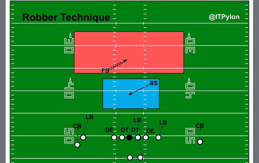 Robber technique is used by pass defenders as part of another, man-zone blend of coverage techniques. Most often deployed with Cover 1, the robber is most often a safety moving from pre-snap positioning indicating another coverage toward the line of scrimmage in the middle of the field, attempting to disrupt crossing, slant, in and dig routes. By moving at or just after the snap, the goal is to disguise the defenders intentions and hopefully confuse the quarterback into making a throw into a congested area.